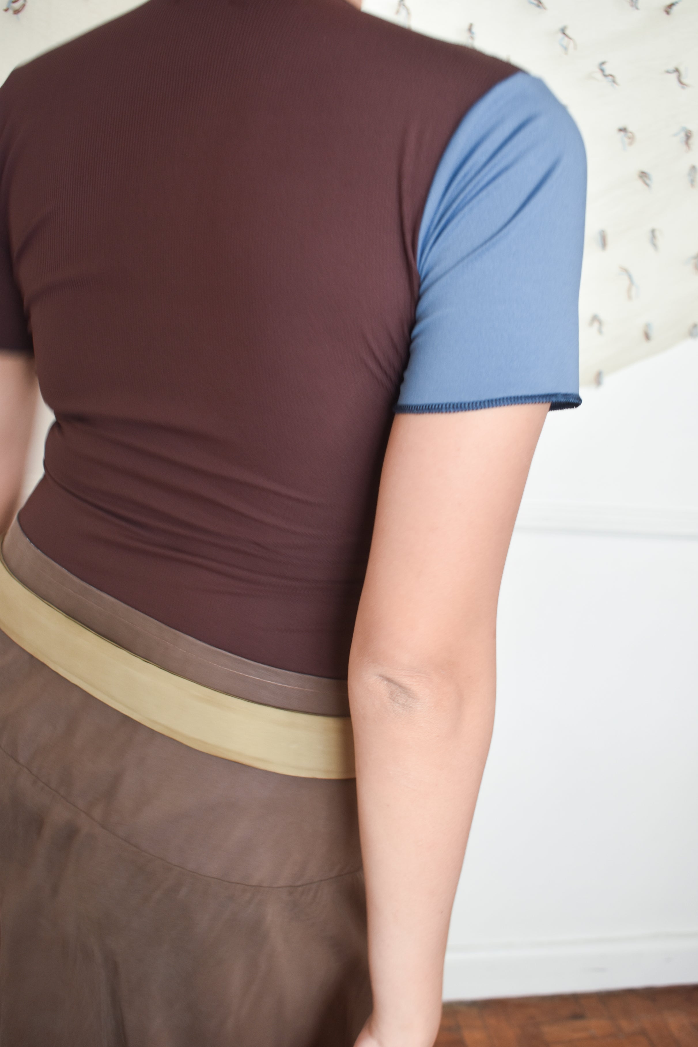 Two-tone rashguard tee in spandex. Darting details on the front.