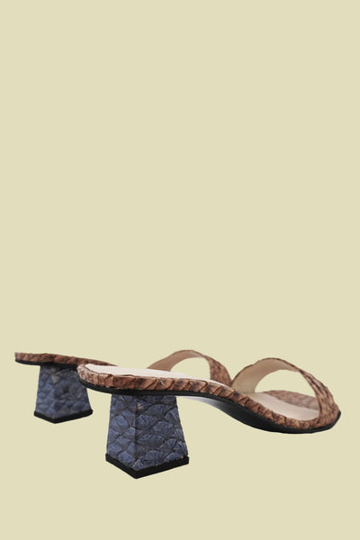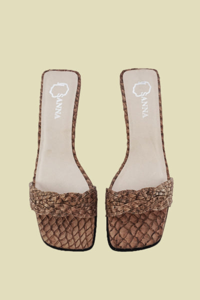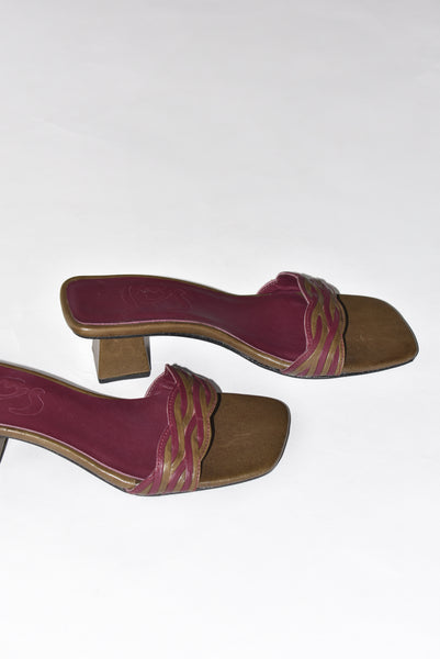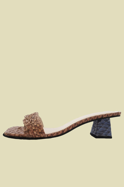Braided leather upper. Lightly padded footbed. Slightly lifted toe. Wooden block heel, wrapped in tonal leather.